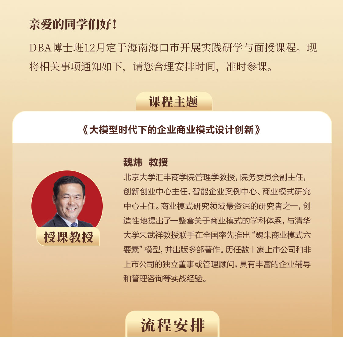 DBA博士班12月定于海南海口市開展實踐研學與面授課程。現將相關事項通知如下,請您合理安排時間,準時參課